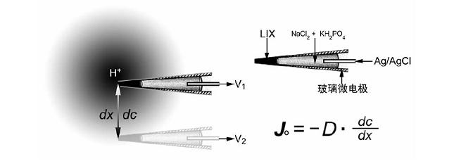 圖2是離子選擇性電極工作原理示意圖。離子選擇性電極由玻璃微電極、Ag/AgCl導線、電解質及液態離子交換劑(liquid ion exchanger,LIX)四部分組成。該電極在待測離子濃度梯度中以已知距離dx進行兩點測量,并分別獲得電壓V1和V2。兩點間的濃度差dc則可以從V1,V2及已知的該電極的電壓/濃度校正曲線計算獲得。D是離子/分子特異的擴散常數(單位:cm-2·sec-1),將它們代入Fick第一擴散定律公式:Jo = - D· dc/dx,可獲得該離子的移動速率(單位:pmol·cm-2·sec-1),即每秒通過一平方厘米的該離子/分子摩爾數。