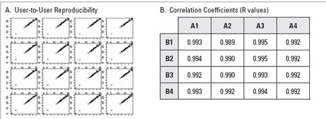 RNA樣品為XpressRefTM人總RNA(GA-004,5.0ug),PCR芯片為人藥物代謝PCR 芯片(APH-022A),采用RT2 Real-TimeTM SYBR Green / 熒光素PCR反應體系(PA-011)。兩位不同的研究者分別進行了4次重復。A圖比較了原始的Ct值。B的表格則說明A中每組比較獲得的曲線的相關系數。