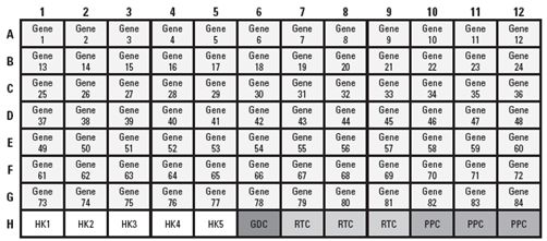 H1-H5孔包含了5個看家基因(HK1-HK5),用于芯片數據的標準化。H6為基因組DNA參照(GDC),其中固定的引物能特異性的檢測非轉錄的基因組DNA重復片段,從而檢測樣品中是否存在DNA污染。H7到H9是三個重復的孔,均為反轉錄參照(RTC),用于檢測RT反應的效率。H10到H12是陽性PCR參照(PPC),反映了PCR反應的效率。這些孔中加入了人工合成的DNA序列和相應的引物對。兩組重復的對照RTC和PPC也可以用于檢測芯片間和芯片內的一致性。
