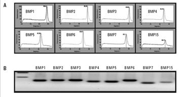 下面是一個檢測PCR芯片特異性的實驗。檢測PCR芯片中TGFβ和骨形成蛋白(BMP)家族各基因的熔解曲線,并且對PCR產物進行凝膠電泳實驗,該家族的基因同源性很高。圖4顯示了BMP基因家族各基因擴增產物的熔解曲線和電泳結果。如圖所示,各熔解曲線均為單峰,電泳條帶亦單一,并且條帶大小與預期值一致。結果表明, PCR 芯片擴增出基因產物特異性高,即使相同RNA樣品中同一基因家族的同源基因也可以區別。優化的體系在SYBR Green檢測中表現出高特異性,而這種特異性通常被認為只能在使用更加昂貴的基于探針的方法才能獲得。