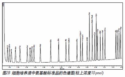 為監測細胞培養過程中發酵液的成分,或者對發酵用培養基進行質量控制,需要分離其它種類的氨基酸。與標準分析方法相比,分析細胞培養液中的氨基酸在分析方法的參數設置上有些不同: AccQ•Tag Ultra 洗脫劑 A (濃縮液)的稀釋倍數不同,還需要較高的柱溫。其它參數相同。