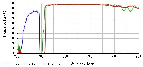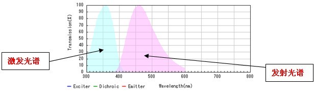 上圖為Olympus U-FUW激發(fā)塊的光譜信息。我們可以了解到此激發(fā)塊可以提供的激發(fā)光波長(zhǎng)在300-400nm之間,剛好可以激發(fā)DAPI。允許透過(guò)的熒光光譜范圍也在410nm以上,所以此激發(fā)塊可以用來(lái)實(shí)現(xiàn)DAPI熒光染料的觀察。