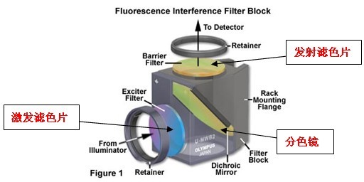 下面我們以熒光顯微鏡的熒光濾色鏡為例,介紹一下濾色鏡組的構(gòu)造以及根據(jù)染料,如何正確選擇濾色片。
