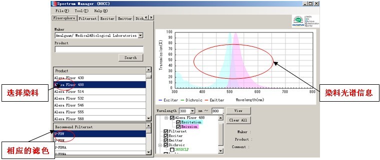Spectrum Manager。用戶選擇熒光染料,軟件會(huì)給出染料的光譜信息和推薦的濾色片選擇等信息,使用非常方便。