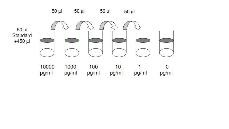 6. 標準品的準備:一次標記6個試管,濃度依次為10000pg/ml,1000pg/ml,100pg/ml,10pg/ml,1pg/ml和0pg/ml。除了10000pg/ml的試管外,其余每管加入450µl生物素標記物。確保所有標準品中生物素標記物的濃度是100 pg/ml很重要。