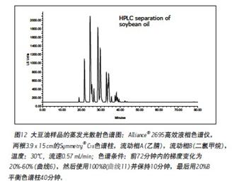 不使用鹵代溶劑做流動相的普通高效液相色譜法很難分離植物油的主要組分——甘油三酸酯。圖12為普通高效液相色譜法(2根5μm粒徑顆粒填充的150mm長的C18柱,蒸發光散射檢測器ELSD)得到的大豆油的典型色譜圖,使用乙腈和二氯甲烷作為流動相,實現該分離需要60多分鐘。由于二氯甲烷在240nm以內具有紫外吸收,這會干擾甘油三酸酯的紫外吸收(最大波長吸收值約210nm),因此使用蒸發光散射檢測器(ELSD)進行檢測。