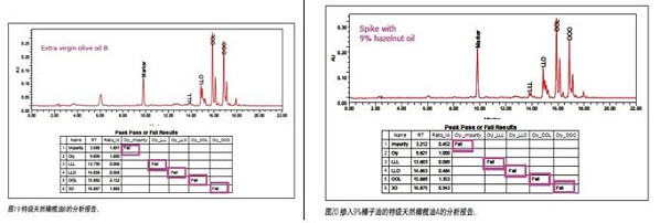 昂貴的特級天然橄欖油通常會被摻入廉價橄欖油和其它植物油(例如大豆油和榛子油)。圖19為一份特級天然橄欖油B的報告。所有指示峰均表明該特級天然橄欖油B未通過根據特級天然橄欖油A制定的質控標準。在該色譜圖中存在保留時間<13.6 min的額外峰,這些數據清楚地表明兩種品牌的橄欖油樣品存在差異,并證實并非所有市售的特級天然橄欖油的品質都相同。圖20為一份摻入9%榛子油的特級天然橄欖油A的報告。所有指示峰均表明該摻假樣品不符合質控標準。而且,根據特級天然橄欖油A制定的同一質控標準也應用于分析其它植物油(圖14-16),同樣摻入1%大豆油或1%玉米油的特級天然橄欖油A,均不合格。