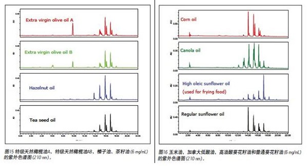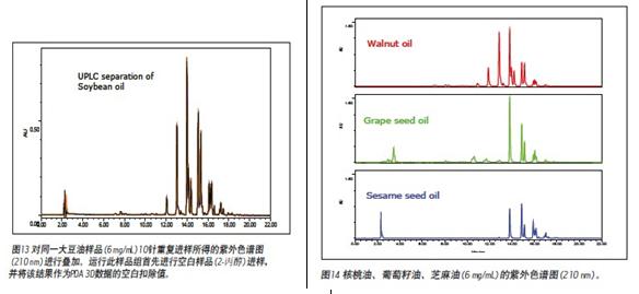 ACQUITY UPLC系統的設計特點是使用小顆粒裝填技術的高效色譜柱,以進行更快速、更靈敏和更高分離度的分離。UPLC的溶劑傳送系統能承受高達15,000 psi的背壓,因此能夠使用2-丙醇等高黏度溶劑進行植物油分析。由于2-丙醇對植物油的溶解性好12、低毒,透射度限制低,便于對甘油三酸酯進行紫外檢測,因此2-丙醇被選作強洗脫液。圖13為關于同一大豆油樣品的10張疊加的紫外色譜圖說明UPLC法的重現性,此分離使用1.7μm粒徑的2.1 x 150mm的 BEH C18色譜柱,乙腈/2-丙醇作為流動相,整個運行時間縮短為22分鐘。圖12和圖13比較,具有相似的甘油三酸酯峰型,但UPLC法具有更高的分離度,更短的運行時間。數據表明不使用致癌溶劑作為流動相,使用 UPLC分離植物油中的組分具有明顯優勢。用于植物油分析的乙腈/2-丙醇流動相的UPLC系統可使用PDA、ELSD和MS檢測器,不像其他用于普通高效液相色譜法的溶劑。一次進樣便可得到多種數據類型,并可以產生可重現的指紋圖譜數據7,通過質譜法鑒別甘油三酸酯組分10,并用PDA多波長掃描測定植物油的氧化程度8。目前已知植物油具有特征的甘油三酸酯比,這對植物油指紋圖譜5-8的鑒別很有用。如圖14-16所示,核桃油、葡萄籽油、芝麻油、特級天然橄欖油A、特級天然橄欖油B、榛子油、茶籽油、玉米油、加拿大低酸油、高油酸葵花籽油和普通葵花籽油的紫外色譜圖證實,每種油樣品都具有獨特的色譜類型,即相對峰強度。
