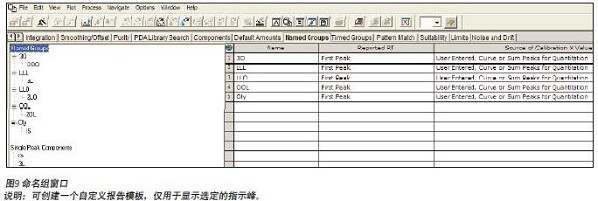 3. 分別將OOO、3L、2LO、2OL和IS從“單峰組分”拖至各自相應的命名組中,如圖9所示。創建合格或不合格報告模板的步驟: