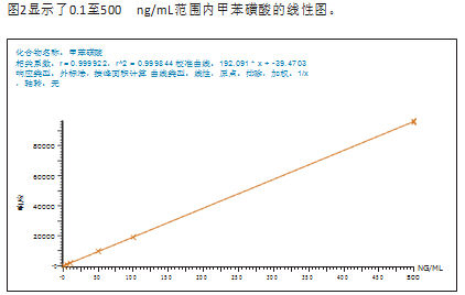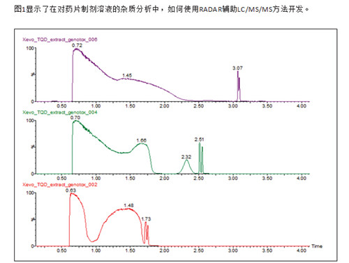 RADAR功能之所以可以實現,是建立在Xevo TQD在MS、MS/MS、正離子與負離子模式超快 的切換速度且不會影響性能的基礎之上的。 使用RADAR輔助LC/MS/MS方法開發,以對加標 藥片溶液中的雜質進行分析。利用最終所開 發的方法來驗證這套液質系統對基因毒性雜 質檢測的線性和靈敏度