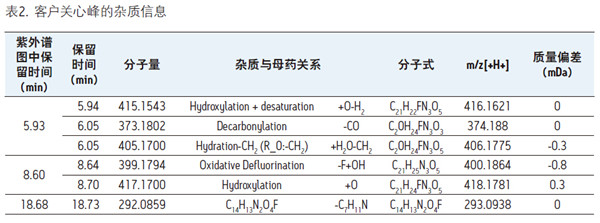 本實驗將常規HPLC色譜柱檢測方法平行轉化為亞2 μm的UPLC色譜柱檢測,分析時間由60 min縮短至25 min,大大提高分析效率,同時流速由1 mL/min降至0.45 mL/min,節約了溶劑成本。分離度及出峰情況與原譜圖保持一致。應用Xevo G2-S QTof能得到最準確的分子量,其雜質質量偏差在0.8 mDa以內,同時利用MeteboLynx智能軟件,快速得到包含所有雜質峰m/z、保留時間、分子量、分子式、質量偏差、峰面積及具體結構信息的雜質列表,提取離子流圖、一級和二級質譜圖等信息,大大節省人力及時間。通過此雜質列表及質譜圖可得到雜質的可能結構,再通過MassFragment功能對雜質二級碎片結構進行匹配進而確定雜質結構。從此推斷流程可看出,在高效的UPLC、精準的QTof儀器及強大的智能軟件幫助下,復雜的雜質結構鑒定工作變得更簡單輕松,對人員的經驗、資歷背景依賴性降低,大大節省人力、物力和時間成本,對于藥物的有關物質研究工作起到積極的推動作用。