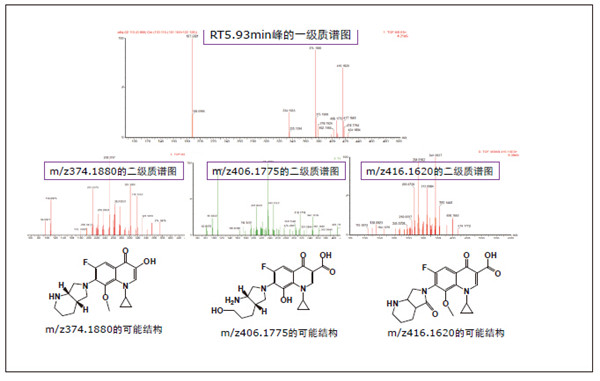 圖11. 紫外譜圖中RT 5.93 min峰包含的雜質一級及二級質譜圖及可能結構
