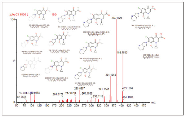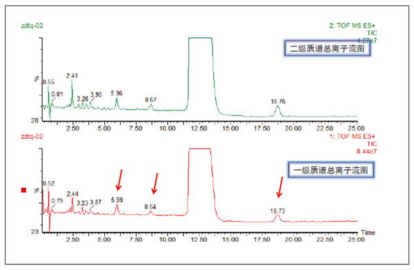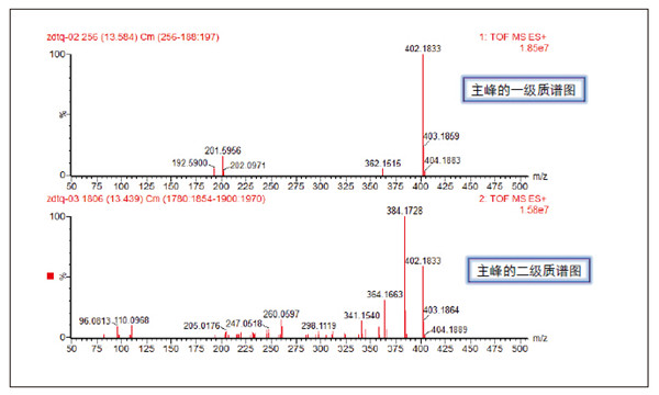與液相紫外相連的為Xevo G2-S QTof質譜,采用MSE這種簡單實用的專利技術采集樣品,可以實現樣品進樣一次同時得到一級質譜圖和豐富的離子碎片信息,其中包括了母離子掃描、子離子掃描和中性丟失掃描的結果,并且避免了雜質信號的丟失。如圖5為一針進樣同時得到莫西沙星注射液(光照10天)樣品的一級質譜總離子流圖、二級質譜總離子流圖。圖6為主峰的一級和二級質譜圖。