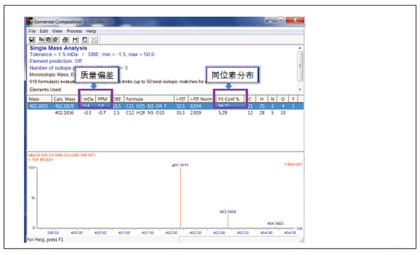 圖7. 通過準確的質量數和同位素分布來確定分子式(以主峰為例)