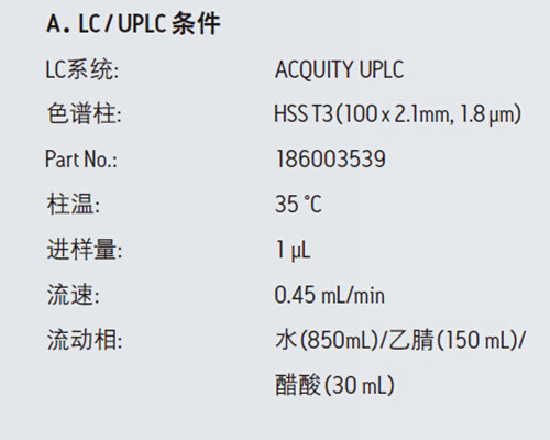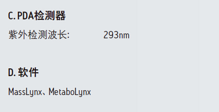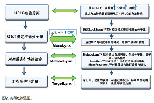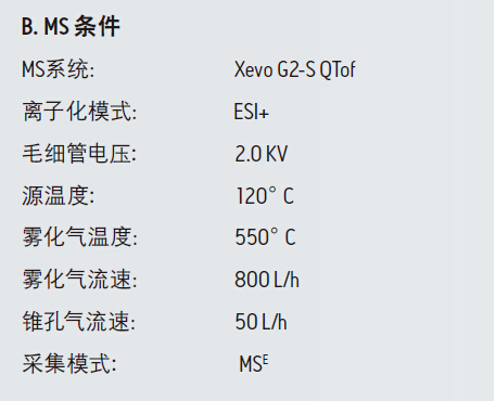 本文采用沃特世(Waters®)超高效液相色譜飛行時間質譜(ACQUITY UPLC/Xevo G2-S QTof)聯用技術對莫西沙星注射液(光照10天)樣品中雜質進行分析,采用亞2 µm色譜柱UPLC方 法 ,使 整 個 分 離 時 間 由60分鐘縮短至25分鐘 ,且 雜 質 得 到 有 效 分 離 ;應 用MassLynx和MetaboLynx軟 件 ,自 動 得 到 包 含各個雜質分子量、分子式、及結構信息的雜質列表,使整個雜質鑒定過程高效快速、節省人力。