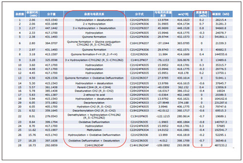 圖10. 通過軟件自動得到的莫西沙星注射液(光照10天)樣品雜質列表,包含雜質峰m/z、保留時