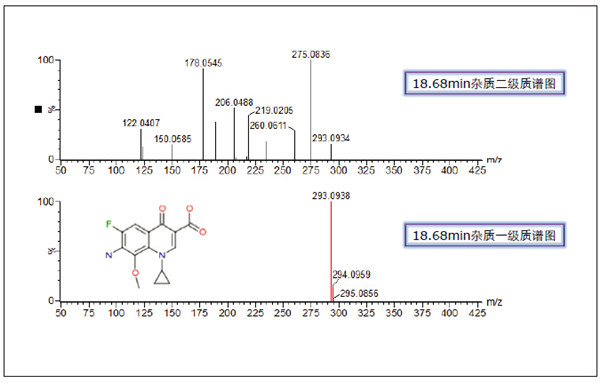 莫西沙星(Moxifloxacin)為人工合成的喹諾酮類抗菌藥,是一類較新的合成抗菌藥。具有抗菌性強、抗菌譜廣、不易產生耐藥性,并對常見耐藥菌有效、半 衰 期 長、不良 反 應 少 等 優 點。臨 床 上 用 于 治 療 呼 吸 系 統 感 染 、生 殖系統感染、皮膚軟組織感染等。莫西沙星原研廠家為德國拜耳,其注射劑在中國的專利保護期即將到期,國內也有多個廠家正在進行莫西沙星的仿制。但如今基于藥品安全的考慮,仿制藥中的有關物質的檢測越發引起注意,中國藥典上也明確規定,藥物中雜質,含量高于0.1%的所有雜質均需對其雜質結構進行鑒別(毒性藥物限度則更低)。所 以 ,如 何 高 效 快 速 地 測定藥物中的雜質,這一課題逐漸成為藥物研究過程中亟待解決的難點。