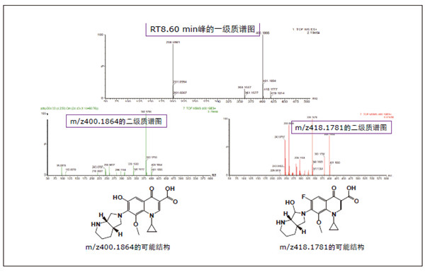 圖12. 紫外譜圖中RT 8.60 min峰包含的雜質一級及二級質譜圖及可能結構
