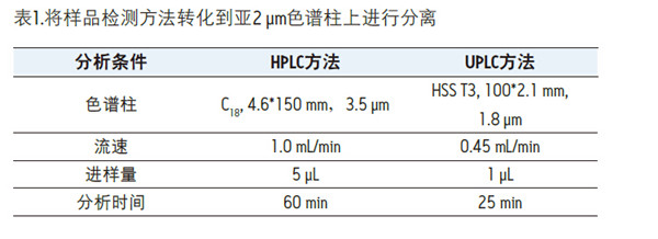 使用方法轉換器及色譜柱選擇卡,將客戶提供的HPLC普通液相平行轉化為UPLC方法,如表1。圖3為客戶使用HPLC得到的紫外譜圖,圖4為轉化為亞2 μm色譜柱后得到的紫外譜圖。從結果可看出,分析時間由60分鐘縮短至25分鐘,流速由1.0 mL/min降低到0.45 mL/min,使用UPLC可提高效率、大大節省成本;同時,從譜圖的分離度及響應來看,UPLC的分離度更好,響應更高(進樣量由5 μL降為1 μL)。其中譜圖中紅色箭頭處幾個大峰為我們特別關注的雜質。