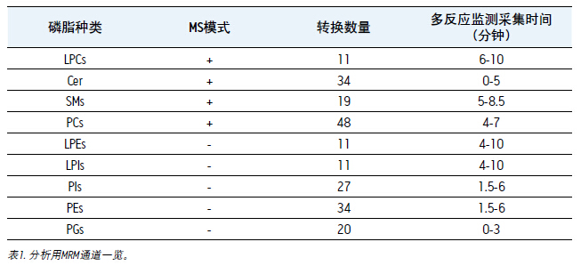 為便于比較,等量相同的人血漿使用Bligh-Dyer法1 進行萃取。鑒于不同的磷脂種類之間動態差異范圍極大,我們分析了兩種濃度的樣本:未經稀釋的、用乙腈按照1/100比例稀釋的。采用帶有正負切換的多反應監測方法,多反應監測時間設定與特定類型磷脂1 的洗脫時間吻合。該方法的簡要介紹如表1所示。