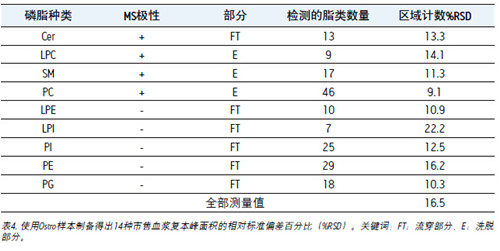使用Ostro萃取市售人血漿的14份樣本。分析每種磷脂三份提取物樣本在流穿(FT)和洗脫(E)部分中的情況。計算每種脂類在所有復本中峰面積的相對標準偏差百分比(%RSDs),如表4所示。