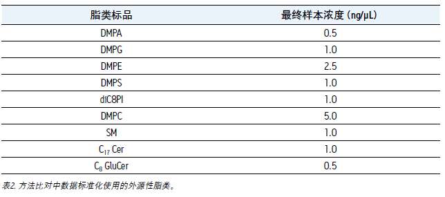 即將分析前,在樣本中加入外源性脂類內標作為空白對照,比較兩種樣本制備方法。該步驟是為了在計算方法或洗脫成分的相對提取率之前對數據進行標準化。加入的脂類及濃度如表2所示。