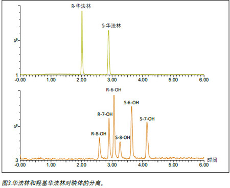 UPC2與MS聯用有利于母體化合物和三種羥基代謝物的對映體分離。華法林、6-羥基華法林、7-羥基華法林和8-羥基華法林對映體在5 min內成功分離,普萘洛爾、4-羥基普萘洛爾、5-羥基普萘洛爾和7-羥基普萘洛爾在15 min內成功