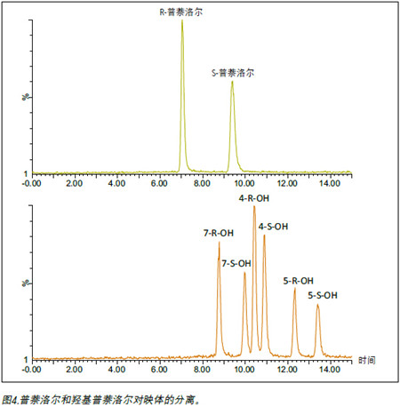 3.0×150 mm色譜柱,以甲酸銨改性的甲醇作為共溶劑對普萘洛爾進行了分離。在本例中,通過使用線性梯度并將柱溫保持在30 ℃,六種構型的羥基普萘洛爾在14 min內成功實現分離。