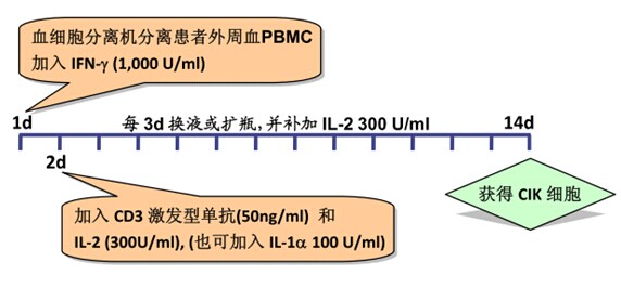 CIK是單個核細胞在CD3單抗和多種細胞因子(包括IFN-γ,IL-2等)的作用下培養獲得的一群以CD3+CD56+細胞為主要效應細胞的異質細胞群,其既具有T淋巴細胞強大的抗腫瘤活性,又具有NK細胞(自然殺傷細胞)的非MHC(主要組織相容性抗原)限制性腫瘤殺傷能力。