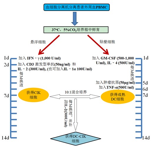 將CIK細胞和同源DC細胞共培養后即可獲得DC-CIK細胞。它既可促進DC細胞的成熟,更能促進ClK的增殖,并加強其抗腫瘤活性。DC細胞是機體免疫應答的始動者,能夠誘導持久有力的特異性抗腫瘤免疫反應;CIK細胞可通過非特異性免疫殺傷作用清除腫瘤患者體內微小殘余病灶,所以負載腫瘤抗原的DC與CIK的有機結合(即DC-CIK細胞)能產生特異性和非特異性的雙重抗腫瘤效應。