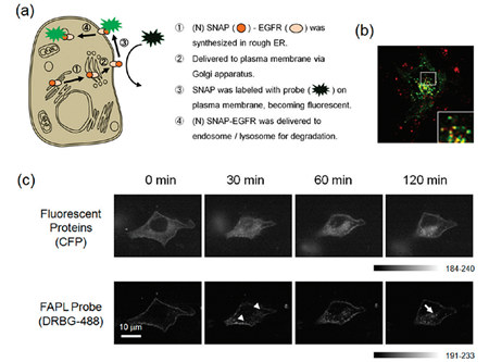圖5.EGFR在細胞中轉運的實時記錄。(a)示意圖,用于解釋如何利用FAPL探針來實時追蹤EGFR相關的細胞膜轉運過程。(b)COS7細胞中表達的EGFR用DRBG-488標記(綠色),溶酶體用lysosometracker(紅色)標記。(c)對表達SNAP-EGFR–CFP的MDCK細胞進行共聚焦實時成像。SNAP-EGFR-CFP用DRBG-488進行標記。在5min時加入了EGF刺激細胞,每個1min拍攝一次熒光圖像。相對于CFP的成像,DRBG-488能夠更清楚的記錄EGF刺激之后囊泡的形成及其在溶酶體里的聚集。