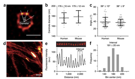 圖10. SiR-tubulin和SiR-actin標記的活細胞的STED成像。(a)人成纖維活細胞中心體上微管的STED代表性圖像(已經(jīng)過Richardson-lucy反卷積運算)。(b)人和小鼠的中心粒的直徑。(c)人和小鼠中心粒中臨近的兩個微管亞復合體之間夾角。(d)16天的大鼠海馬區(qū)元代神經(jīng)元在用SiR-actin染色后的STED原始圖像。(e-f)微絲在神經(jīng)元軸突上以間隔為181±20 nm的距離成周期性分布。