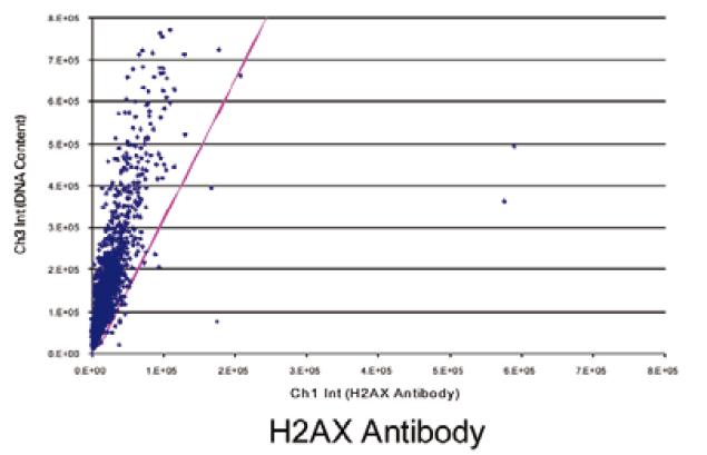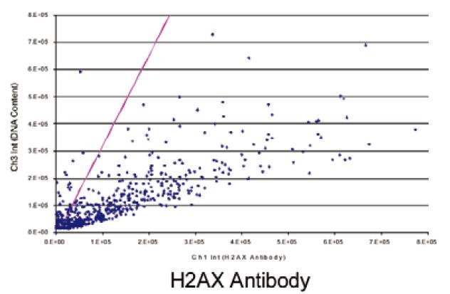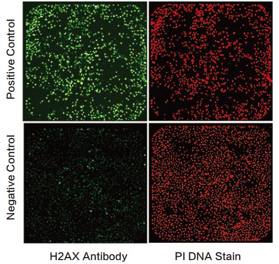圖2中列舉的用磷酸化H2AX和PI染色細胞作為陰性和陽性對照,我們在圖3中展示了其雙參數點陣圖結果。紫色分割線代表Ch3/Ch1的比率,其X軸截距可調節,而這一比率定義了自動化DNA損傷定量檢測的標準。其中陰性對照樣本的比率為1.9%而陽性對照樣本(已經用RNAi技術處理過增加了DNA損傷幾率)的比率為88.5%。