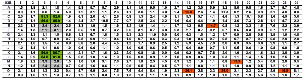圖4 展示了按照384孔板布局排布的RNAi篩選DNA損傷的百分比結果。陰性對照空(8個)標記為灰色,陽性對照孔(8個)標記為綠色。Z’值為0.9,其他RNAi處理孔的損傷率為13.5%,標記為橙色。