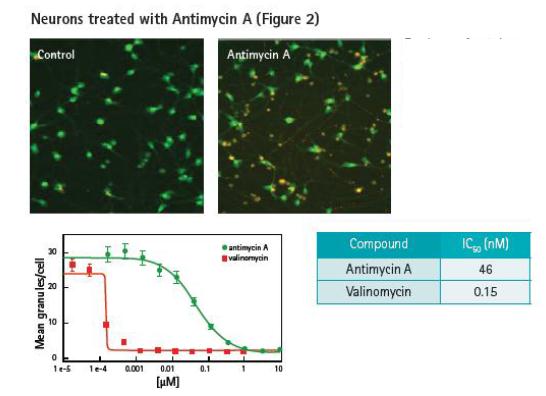 線粒體膜的去極化過程被認為是缺氧性損傷和細胞毒性的重要早期標志,運用JC-10染料可以對線粒體膜電位進行監測。在正常細胞中,聚集在線粒體中的JC-10呈橘紅色,而當線粒體內膜電位降低后,JC-10則從線粒體中以單體形式釋放到細胞質中并發出綠色熒光。 用JC-10對神經細胞進行染色并用抗霉素或者氨基霉素處理30min,后兩者可以有效阻斷細胞的氧化呼吸過程及鈣離子過載。用戶可以自定義MetaXpress Software 中的Granularity模塊來識別線粒體中JC-10的密度和大小。數據結果將被標準化到每個視野。