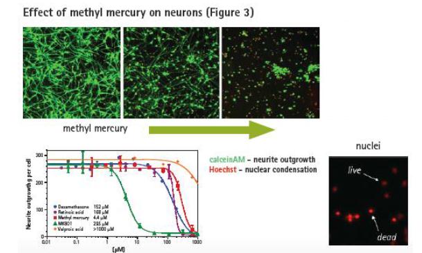 上:圖片所示為不同濃度methyl mercury對神經元細胞的毒性作用。Calcein AM的存在說明活細胞代謝活動(綠色)。下左:毒性化合物的IC50曲線,依據測量的神經突觸和細胞核大小顯示的毒性所繪制。下右:Hoechst染色的細胞核被標記為紅色。