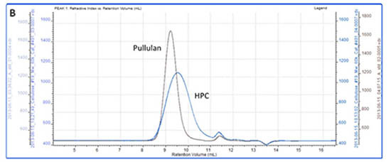 所有樣品均在系統(tǒng)內(nèi)成功分離。顯示了果膠、阿拉伯膠和葡聚糖(圖 2A)及支鏈淀粉和 HPC(圖 2B)的 RI疊加色譜圖。