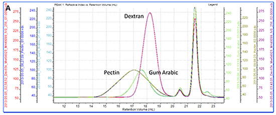 圖 2A:果膠、葡聚糖和阿拉伯膠的RI疊加色譜圖