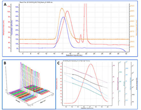 圖3:A.顯示果膠RI(紅色)、LS (90°)(橙色)和 IV(藍(lán)色)檢測器響應(yīng)的色譜圖。B.顯示 MALS 數(shù)據(jù)的曲線。C. 顯示與所測得的 Rg(栗色)、分子量(黑色)、IV(藍(lán)綠色)和 Rh(青色)重疊的 RI 峰值衍生數(shù)據(jù)。