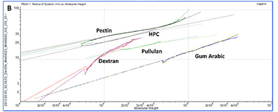 在對 Mark-Houwink 和構(gòu)象圖進(jìn)行研究時,結(jié)果中所包含的信息隨即變得清晰起來。阿拉伯膠是樣品中分子量最高的,然而,它在兩個圖中的曲線卻是“最低的”:在質(zhì)量上,它是所研究分子中最小的(構(gòu)象圖)或是密度最大的(Mark-Houwink 圖)。雖然阿拉伯膠主要是多糖,但通常也含有蛋白質(zhì)成分,這使其在僅增加了較小分子大小的同時增加了分子質(zhì)量,所以上述結(jié)果也是意料之中的。