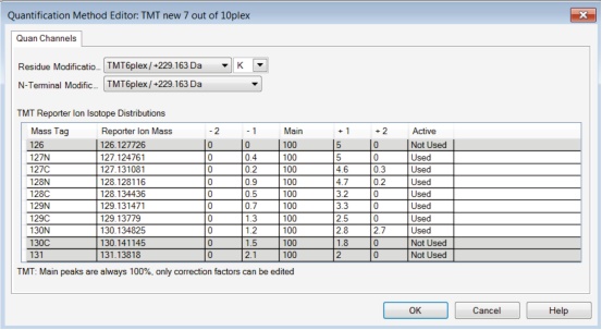 4. 根據研究需要,在“active”列中選擇/去除報告離子通道。