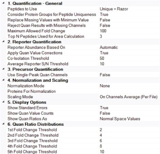 采用 Proteome Discoverer 軟件 2.1 版本(PD 2.1)進行數據處理。該軟件的特色是提供了全新改進版的 TMT 定量分析工作流程,其新功能包括:1)可用于添加報告離子同位素分布的全新用戶界面;2)解析 TMT10plex 試劑中報告離子同位素雜質的能力;3)實現基于信噪比(S/N 值)的 TMT 定量分析;4)根據 S/N 值歸總進行蛋白質和肽段定量分析; 5)提供對肽段和蛋白質豐度值進行歸一化和標準化新方法。