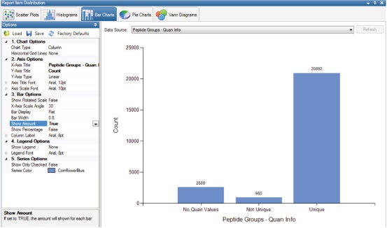 6. 要得到可定量的肽段數量,進入 View,選擇 Distribution Charts。在 Bar Charts 中選擇 Peptide Groups-Quan Info 可以顯示有和沒有 Quan Values 的肽段組(圖 11)。
