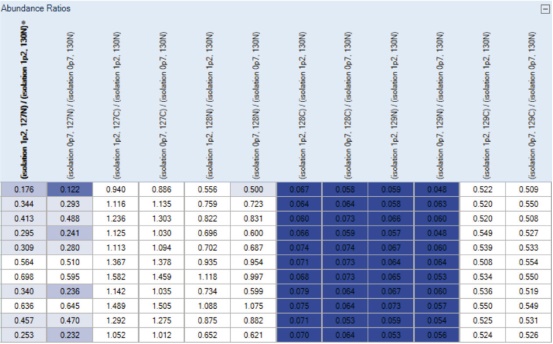 圖 12. 結果中的 Abundance Ratios 欄。比值分別按 Isolation Windows 和 Quan Channel 排序。比例上調或下調的蛋白質用不同顏色高亮顯示。顏色越深代表變化程度越顯著。