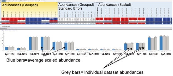 圖13. 每個數據組中蛋白質的豐度(Abundances (Grouped))、標準誤差(Standard Errors)、折合豐度 (scaled Abundances)的圖示說明。