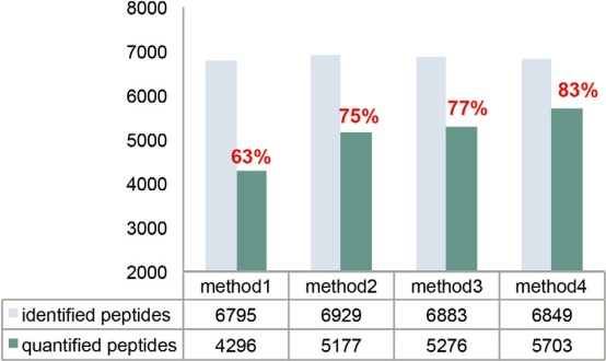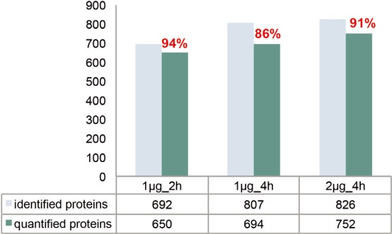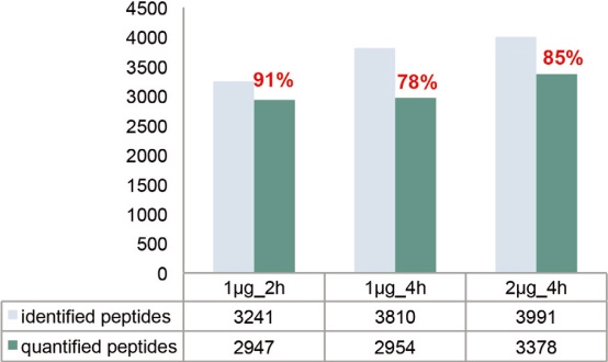 隨著樣品復雜度增加,洗脫梯度也應相應地加長(e.g.,4 小時)以保證更好的色譜分離。然而加長洗脫梯度又不可避免地會導致色譜峰變寬以及母離子 S/N 降低。因此應當考慮增加進樣量或是提高最大注入時間的限制。最終用于評價實驗效果的指標應當是可定量肽段的數量,而所謂可定量肽段是指碎片譜圖包含所有預測報告離子峰的那些肽段。如圖 14 A 中所示,對于 1 μg 進樣量,將洗脫梯度的時間從 2 小時增加到 4 小時,鑒定出的肽段數量從 3,241 個增加到了 3,810 個。鑒定結果顯然受益于分離效果的改善,因為對低豐度肽段的檢測靈敏度增加使得蛋白序列覆蓋率也相應地提高了。另一方面,可定量肽段數并沒有增加,因為最大注入時間設置與 2 小時的梯度相同(表 2)。如果在加長洗脫梯度的同時將進樣量增加到 2 μg,則增加了 400 多條可定量肽段,將肽段的可定量數/可鑒定數所占比例提高到了 85%。同樣地,可定量蛋白質組數也隨著色譜梯度時間和進樣量的共同增加而增加(圖 14B)。這一結果說明,對于高動態范圍的樣品(20:1),實現色譜分離條件、進樣量和最大注入時間的最佳匹配才能取得可靠的定量分析結果。