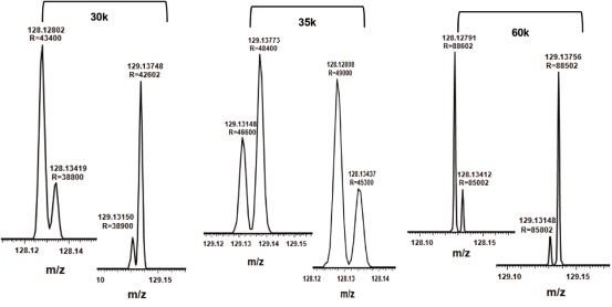 圖 15. 分辨率設置分別為 30,000,35,000 和 60,000 時,TMT10plex 標記肽段報告離子區域細節圖。請注意,在 30,000 分辨率下僅得到部分分離。