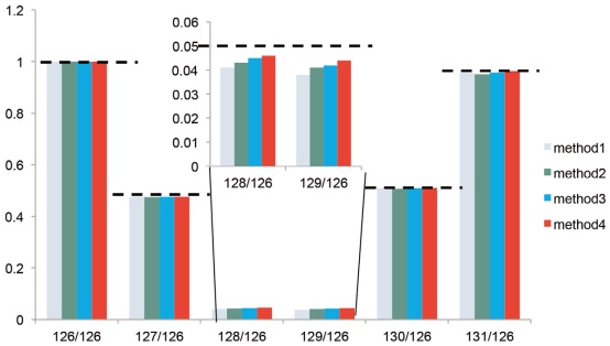 圖 17. TMT-標記的純 E. coli 中的比值。預期比例用虛線表示。請注意對于 128/126 和 129/126 比例,方法 4 的定量分析準確度最高。