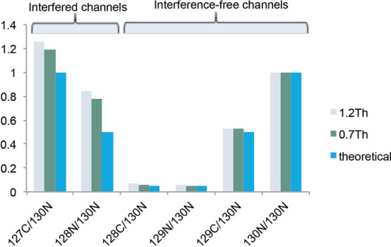 Q Exactive 類型的儀器通常建議使用 2 Th 的隔離窗口,能夠保證足夠的離子傳輸和靈敏度。然而,擴大隔離窗口會使干擾離子與母離子一并被隔離出來,降低了報告離子的定量分析準確性。