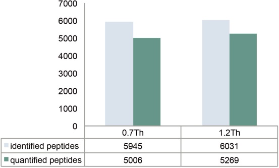 圖 18. 不同隔離窗口設置下的可鑒定和可定量肽段組數。顯示數據是 E. coli 樣品進行兩次平行分析的綜合結果。